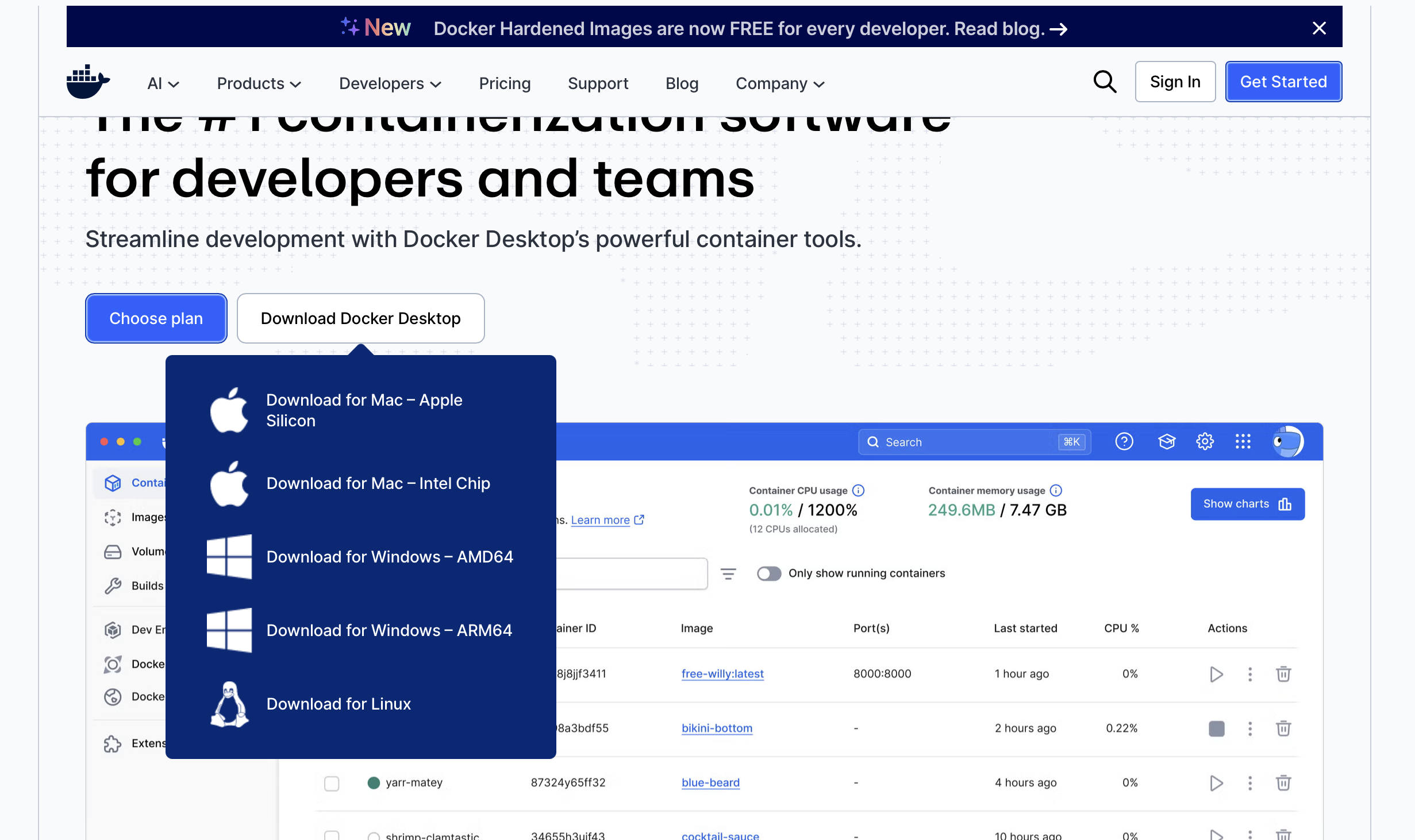 Open a browser and go to www.docker.com/products/docker-desktop. Click on Download Docker Desktop and select the right download for your OS, as illustrated below: