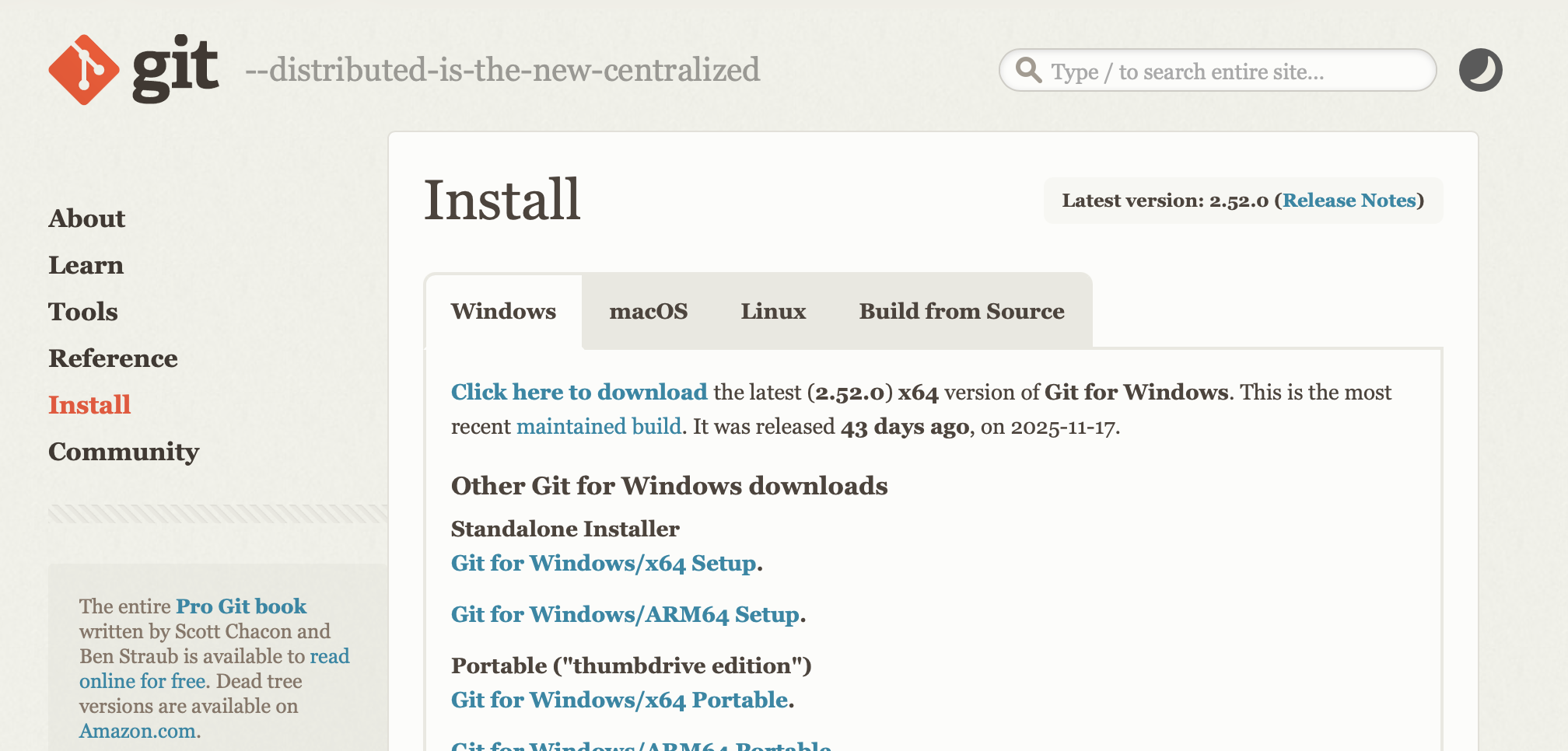 To install git on Windows go to https://git-scm.com/install/windows and download the installer (Git for Windows/x64 Setup).