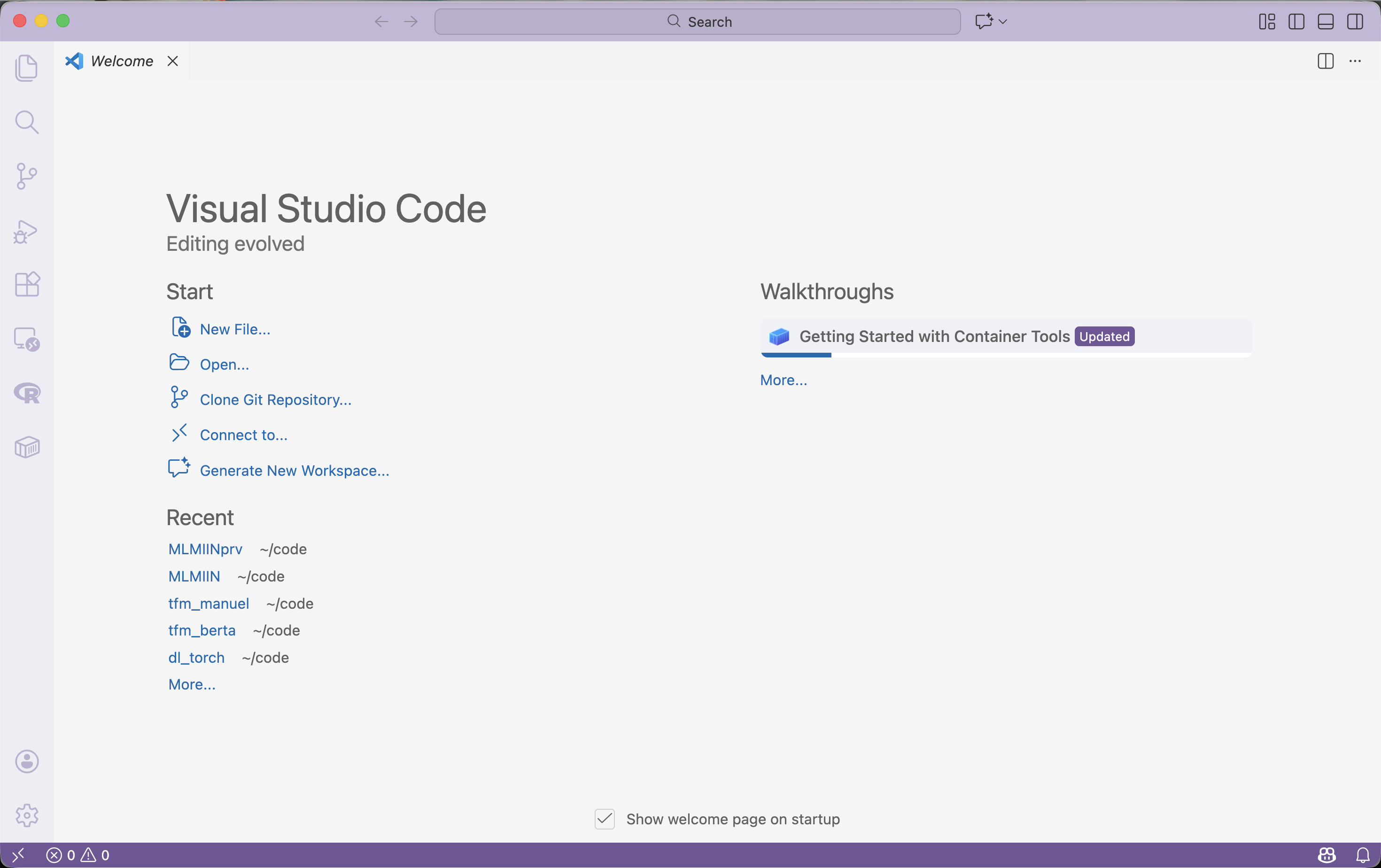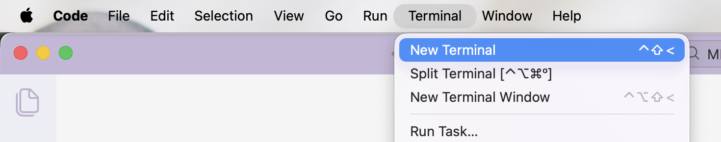 Click on Terminal → New Terminal to open a terminal window in VS Code.